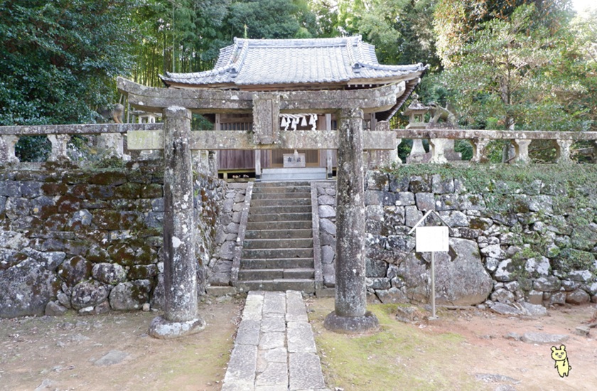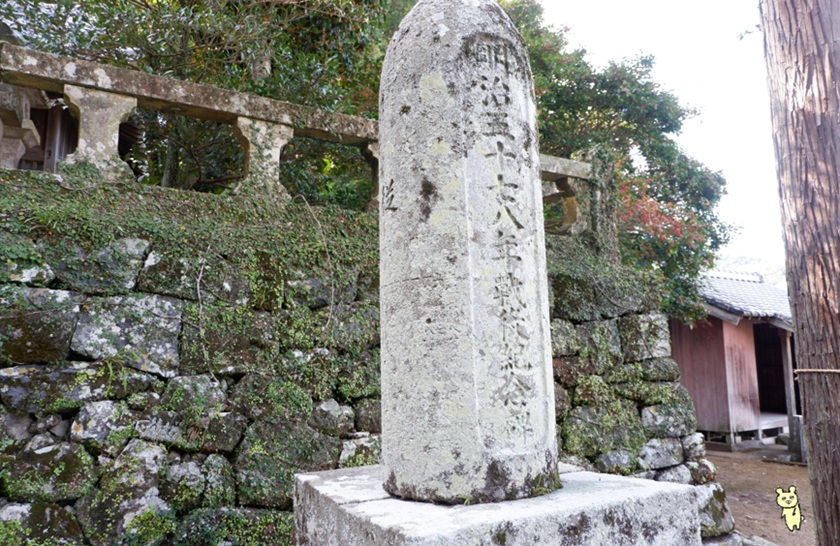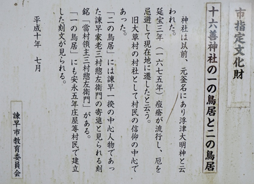 「二の鳥居」には、諫早一揆の中心人物であった諫早家老三村惣左衛門の寄進と見られる刻銘「當村領主三村惣左衛門」がある。
