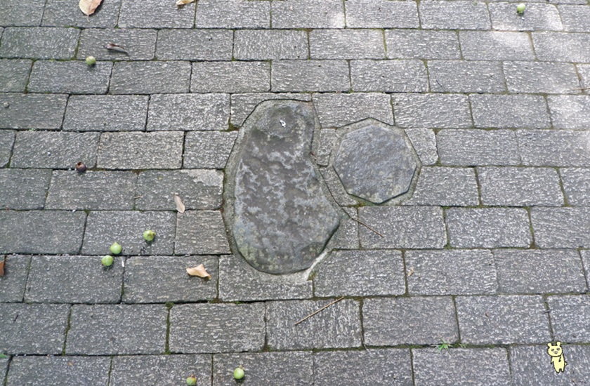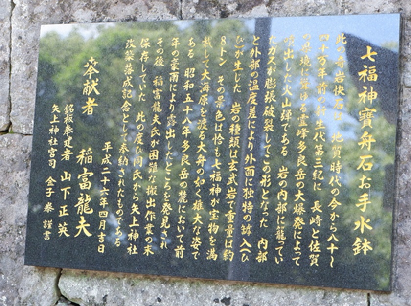 参道敷石にある八角形の玄武岩は新日見トンネルの貫通石。