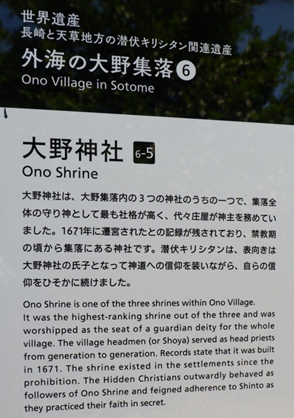 住民のほとんどは大野神社の氏子だったため、潜伏キリシタンは表向きは神道の氏子として装っていたようです。