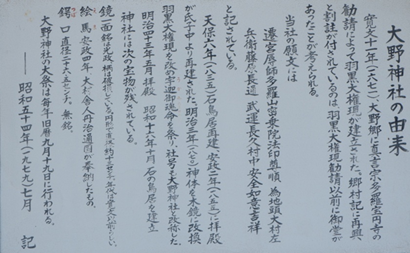 大野神社は大野集落内にある3つの神社うちの一つで、集落全体の守り神として最も社格が高く、代々庄屋が神主を務めていたとのことです。